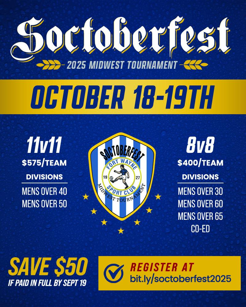 Midwest SoctoberFestSoctoberFest is an annual festival full of soccer tournaments held at the Fort Wayne Sport Club to celebrate our love of Soccer and German Culture. Saturday Oct. 18 and Sunday Oct. 19 the Tournament is held. Teams from across the country compete for the chance to be the best in the midwest. Games are held on a beautifully maintained soccer complex with a traditional German clubhouse which includes showers and restrooms. Food and beverages will be available throughout the tournament. Trophies will be award to 1st and 2nd place teams in each division. Team Information:Divisions: Over 30, Over 40, Over 50*, Over 60, Women's Open*Two underage players (two years younger) allowed per team for each age group. i.e. two 48 year olds playing on a Over 50 teamTeams: Maximum of 8 teams per Division / 3 games guaranteedEach team can have a roster of 20 players with a max of 18 players dressing for a game.Each team will receive food tickets to use at the club.If your team will need guest players to fill your roster, please contact the Tournament Directors for help. Individual Guest Player Fee: $35****Players must stay with assigned team.Reasonable hotel block rates will be available.Tournament rules can be found below. Registration and Fees:Please note fees will be collected after the registration process has been completed.Registration Fee: $575 O30, O40 & O50 $400 O60 and Women's TeamsEarly Registration Fee: $400 O30, O40 & O50 $325 O60 and Women's TeamsDeposit of $150 to hold your team. This fee is non-refundable after September 3rd. Register HereContact Information:Over 40 Division: Christy Pinkley (260) 437-4188 [email protected]Over 50 Division: Nick Balmoria (260) 414-9101 [email protected]